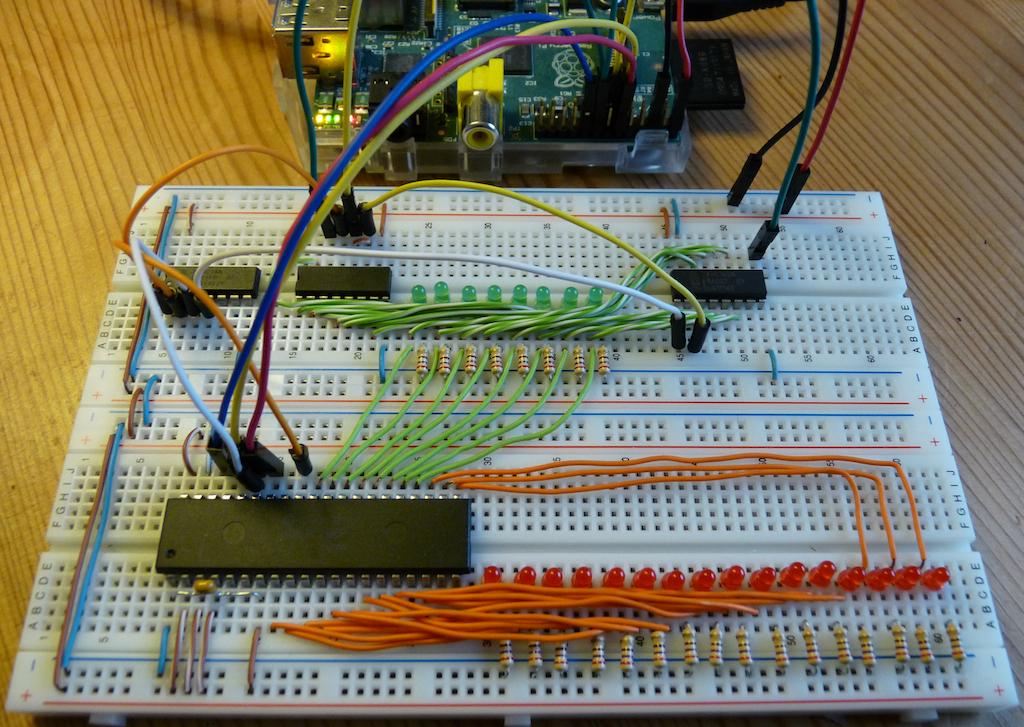 In part two we constructed a circuit using shift registers whereby we could write a byte of data and then read it back in. In part three we booted a 6309 CPU and ran it with a hard-coded operation on the data bus. In this final post, we will put the two together so that we can write arbitrary data onto the data bus and then read back any results.