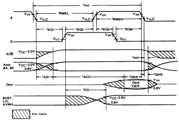 The part we are interested in is the “Data” line, and the timing when the data is readable is the time between the Q clock going low and the E clock going low.